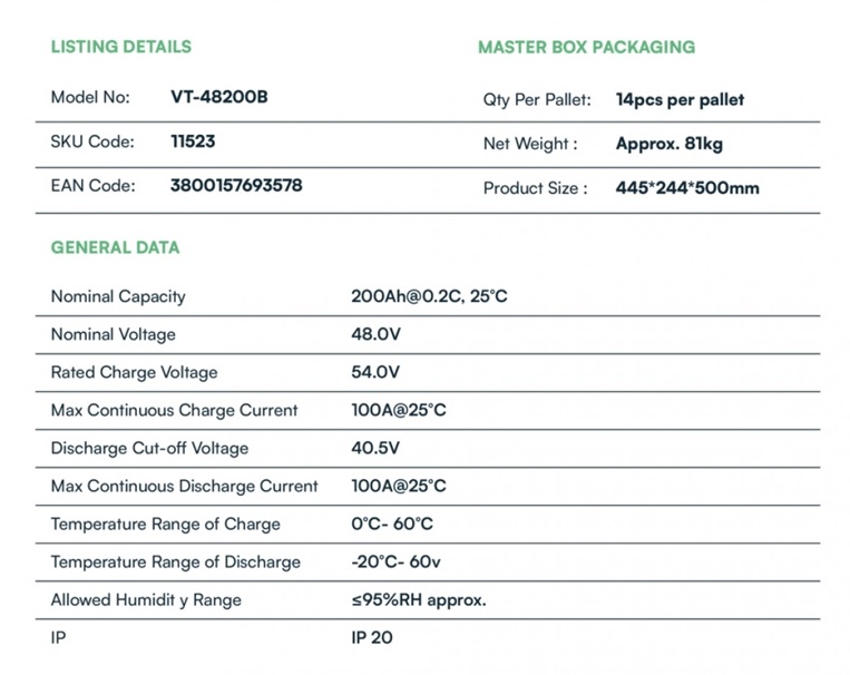 - Număr Model: VT-48200B, specific liniei de produse Vestwoods pentru stocarea energiei.